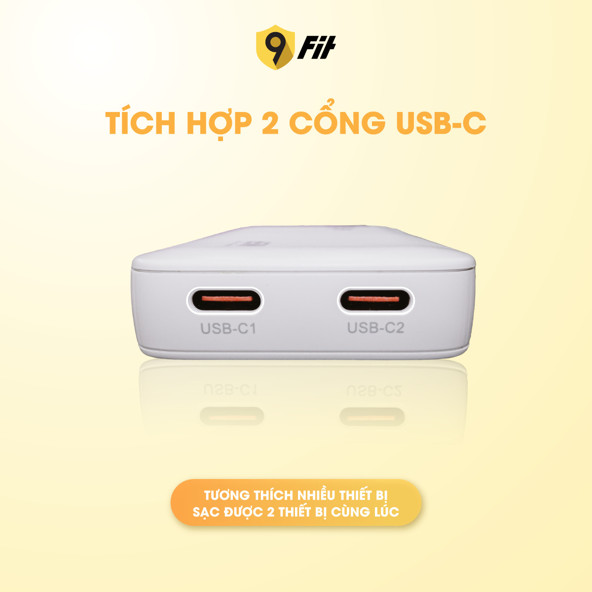 Sạc 9Fit Slim PD 65W 2C GaN được trang bị hai cổng USB-C, cho phép sạc đồng thời hai thiết bị một cách linh hoạt. Hệ thống sẽ tự động điều chỉnh và phân bổ công suất phù hợp để đảm bảo tốc độ sạc ổn định, an toàn cho từng thiết bị.