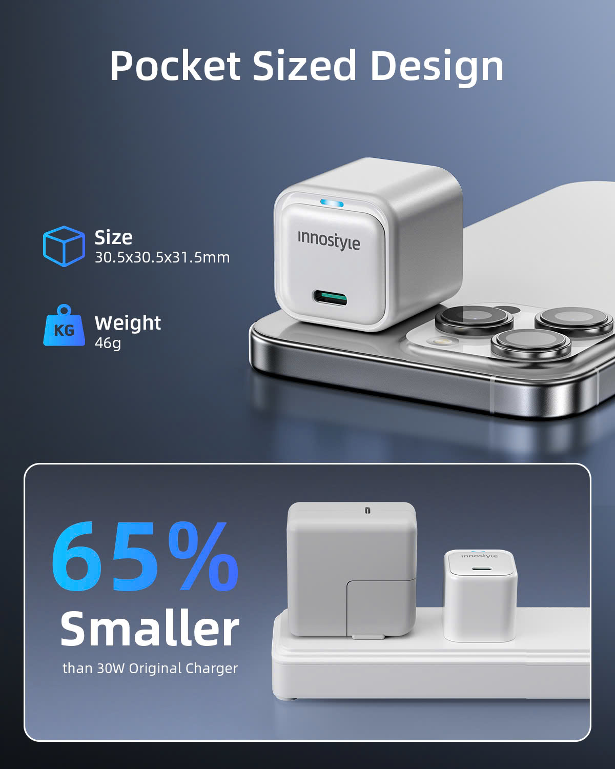 Với kích thước chỉ 30,5 × 30,5 × 31,5 mm và trọng lượng vỏn vẹn 46 g, Cốc sạc Innostyle GoCharge 35W 1C Charger được xem là một trong những cốc sạc GaN 35W nhỏ nhất thị trường. Người dùng có thể dễ dàng bỏ túi áo, balo, túi xách hoặc vali du lịch mà không hề chiếm diện tích hay gây vướng víu. Nhờ công nghệ GaN II tiên tiến, Cốc sạc nhanh Innostyle GoCharge 35W 1C Charger không cần sử dụng nhiều linh kiện to lớn như sạc silicon truyền thống. Điều này giúp thiết bị nhỏ hơn 40% nhưng hiệu năng cao hơn tới 30%, đồng thời tỏa nhiệt ít hơn và tiết kiệm năng lượng hơn.