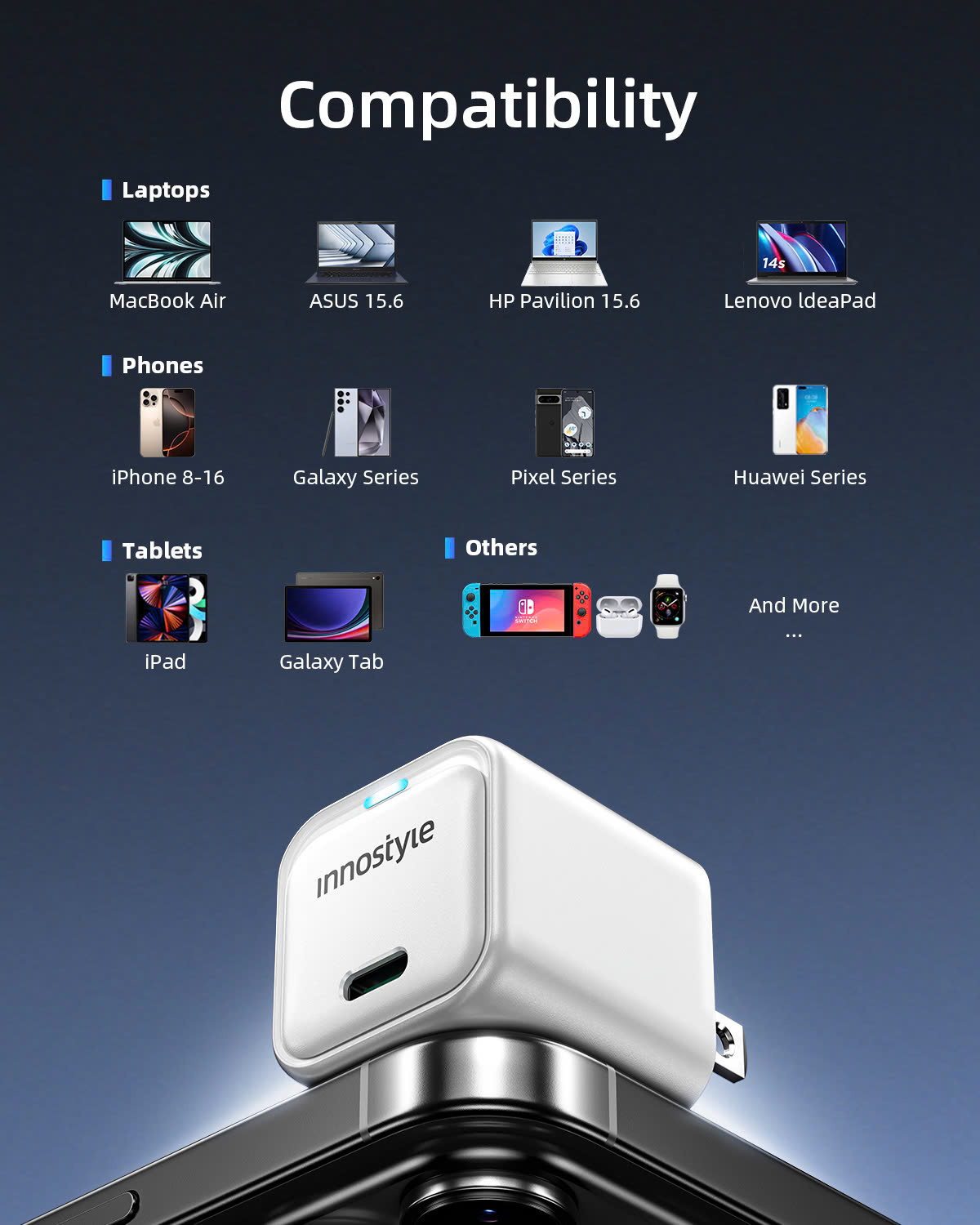 Khả năng tương thích đa dạng là một trong những điểm mạnh nổi bật của Cốc sạc Innostyle GoCharge 35W 1C Charger. Thiết bị đáp ứng hầu hết nhu cầu sạc của người dùng di động hiện nay - từ smartphone, tablet cho đến laptop và phụ kiện thông minh. Với công nghệ PD (Power Delivery) và PPS (Programmable Power Supply) tiên tiến, Cốc sạc nhanh Innostyle GoCharge 35W 1C Charger có khả năng tự động nhận dạng và điều chỉnh dòng điện phù hợp, đảm bảo quá trình sạc diễn ra nhanh chóng, an toàn và ổn định cho mọi thiết bị.