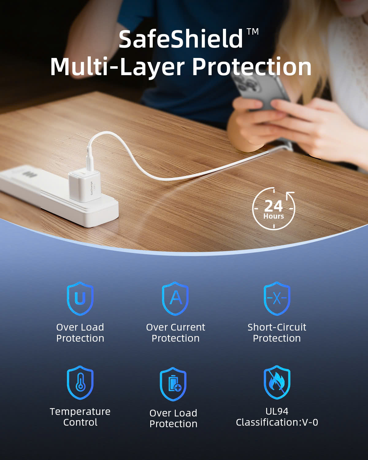 SafeShield™: Hệ thống bảo vệ toàn diện chống quá dòng, quá nhiệt và ngắn mạch, giúp Cốc sạc Innostyle GoCharge 35W 1C Charger hoạt động an toàn trong mọi môi trường.
