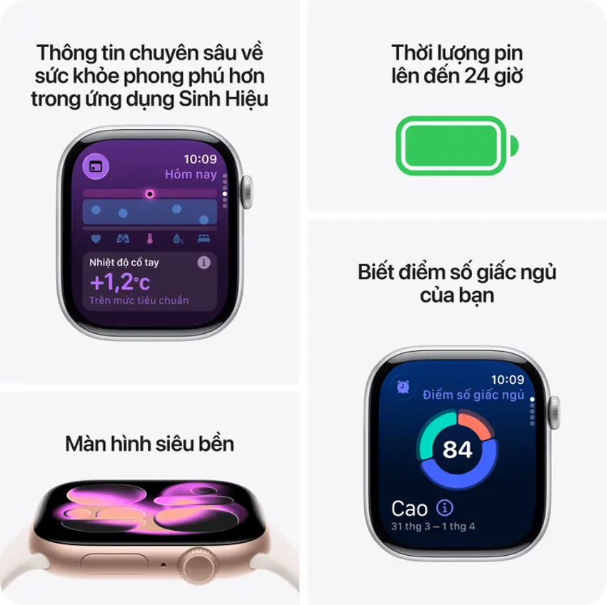 Người chú trọng sức khỏe: Hệ cảm biến Gen mới + Vitals/Sleep Score hỗ trợ theo dõi nhịp tim, SpO₂, nhiệt độ, giấc ngủ theo xu hướng; cảnh báo nhịp tim bất thường và ngưng thở khi ngủ giúp bạn kịp thời điều chỉnh lối sống hoặc tìm tư vấn y khoa. Dữ liệu đồng bộ Health hiển thị biểu đồ dễ hiểu, thuận tiện đặt mục tiêu và theo dõi tiến bộ.