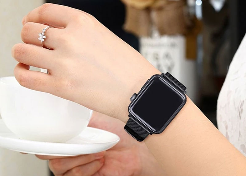 Thiết bị có thiết kế dây đeo sử dụng chất liệu thép Milanese có nút cài nam châm, tiện lợi cho việc điều chỉnh độ rộng của dây sao cho phù hợp với cổ tay người đeo.