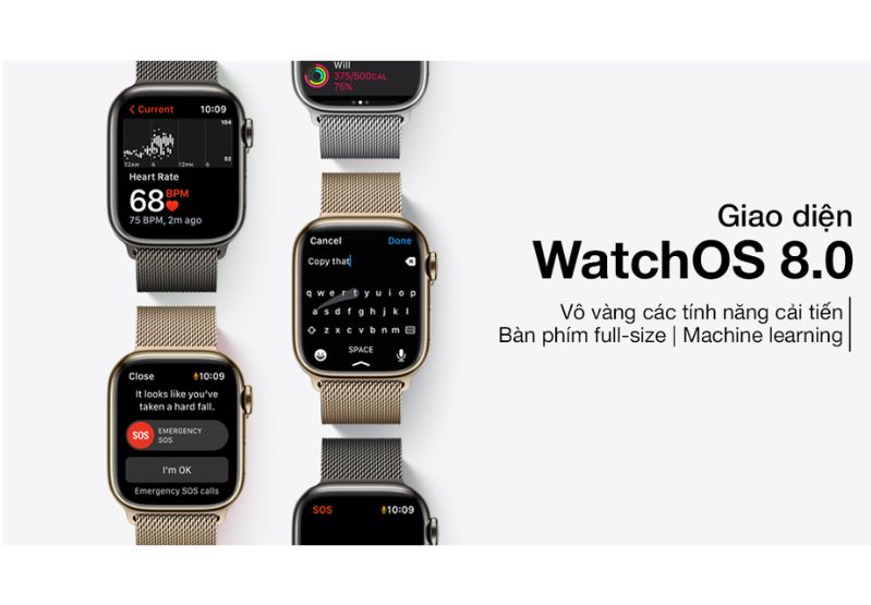 Hệ điều hành WatchOS 8 có nhiều cải tiến mới cho sản phẩm như tăng kích cỡ các nút bấm trên màn hình giúp việc thao tác chân thực chính xác, nhanh chóng, quan sát dễ dàng hơn. Việc nhập văn bản không thành vấn đề với bộ bàn phím hoàn chỉnh, có thể gõ văn bản nhanh hơn bằng cách lướt QuickPath và còn có cả Machine Learning giúp dự đoán từ tiếp theo mà người dùng có sẽ gõ.