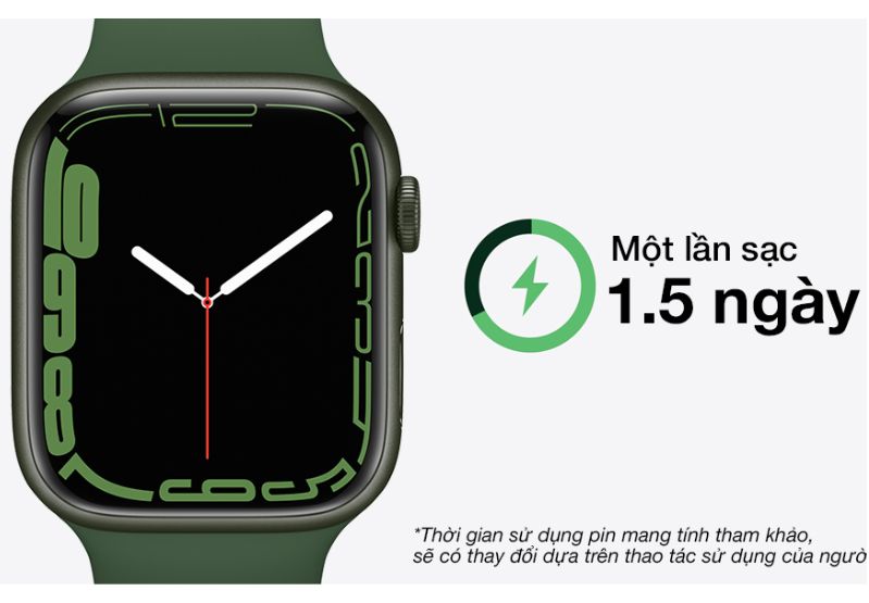 Apple Watch Series 7 dùng viên pin có dung lượng 303.8 mAh, sạc đầy trong 1.3 giờ thông qua đế sạc nam châm và thời gian sử dụng là 1.5 ngày.