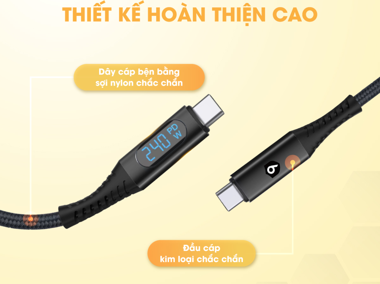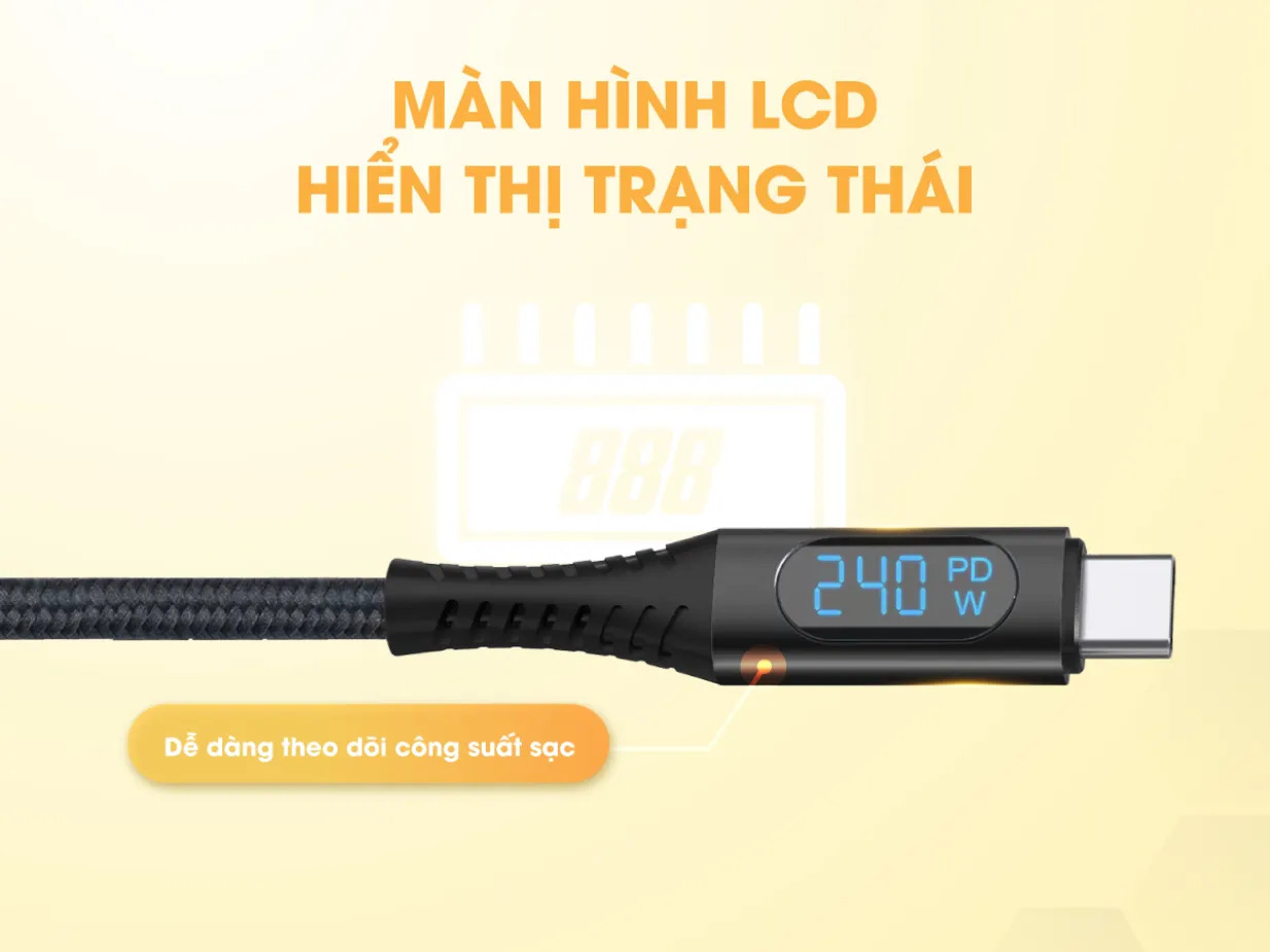 Màn hình LCD mini tích hợp trên thân cáp: đây chính là điểm nhấn thiết kế nổi bật. Người dùng có thể dễ dàng theo dõi công suất sạc theo thời gian thực, giúp kiểm soát tốt hơn khi sạc thiết bị cao cấp như MacBook hay iPhone đời mới. Ngoài ra, màn hình LCD còn hiển thị đầy đủ điện áp, cường độ dòng điện và phần trăm pin, giúp bạn nắm bắt chính xác trạng thái sạc mà không cần ứng dụng hỗ trợ.