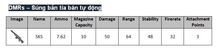 Như đã nói ở trên, các loại súng bắn tỉa gây bận lợi khi thay đạn khá lâu, vì vậy DMRs được coi là giải pháp để khắc phục tình hình. Tuy nhiên nó lại không mang tới khả năng dame cao như Sniper Rifles, tầm bắn cũng bị hạn chế hơn nhiều. Với loại súng này phù hợp để tiêu diệt các mục tiêu di động hoặc ở khoảng cách trung bình.