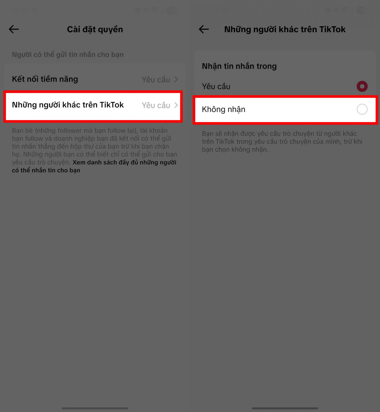 Bước 3: Chọn mục Những người khác trên TikTok → Chuyển tùy chọn sang chế độ Không nhận để hoàn tất thiết lập.