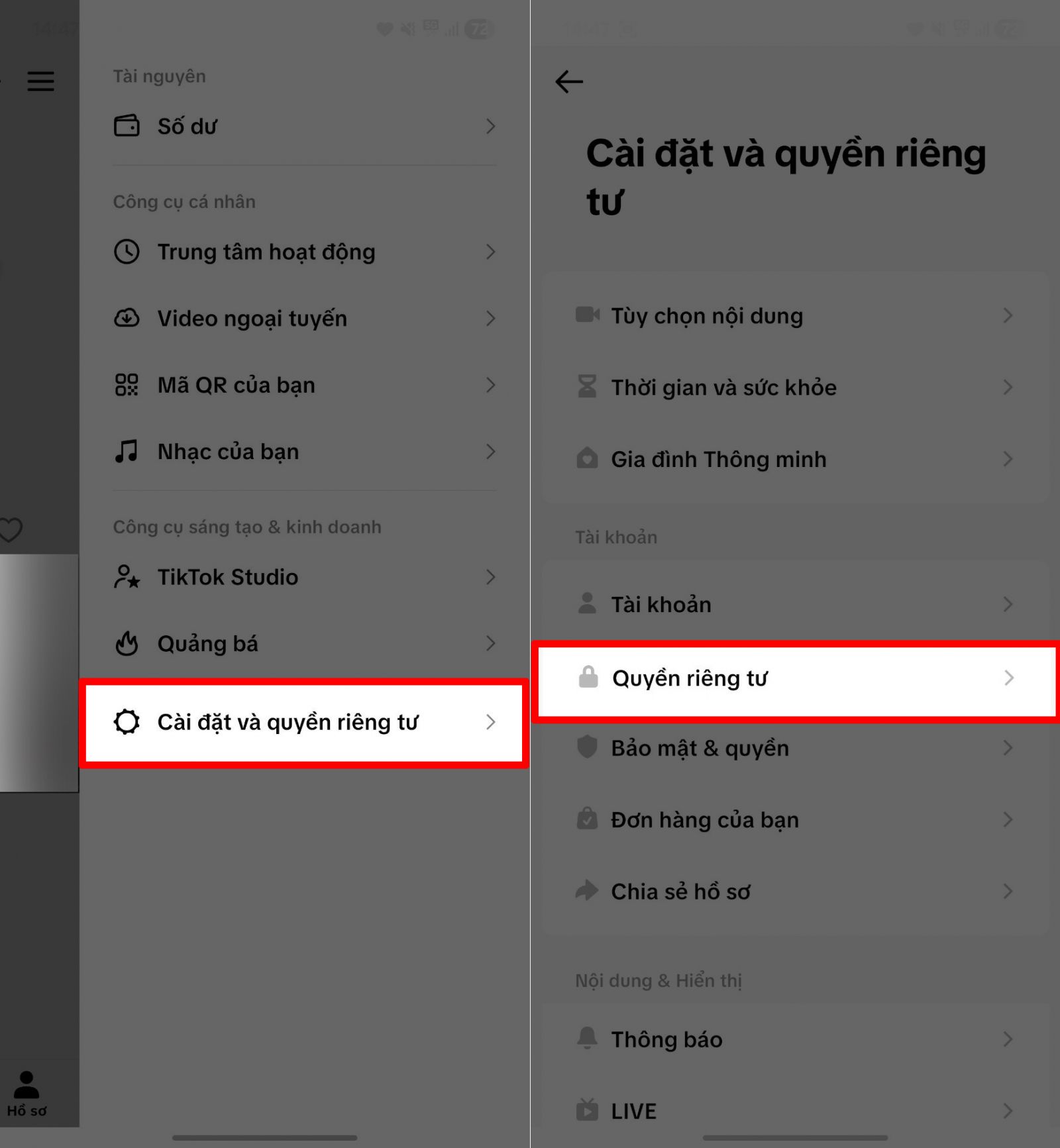Bước 1: Mở ứng dụng TikTok trên điện thoại → Nhấn vào biểu tượng ba dấu gạch ngang (☰) ở góc trên bên phải màn hình để mở Menu → Chọn mục Cài đặt và quyền riêng tư → Nhấn vào Quyền riêng tư để vào phần thiết lập bảo mật tài khoản.