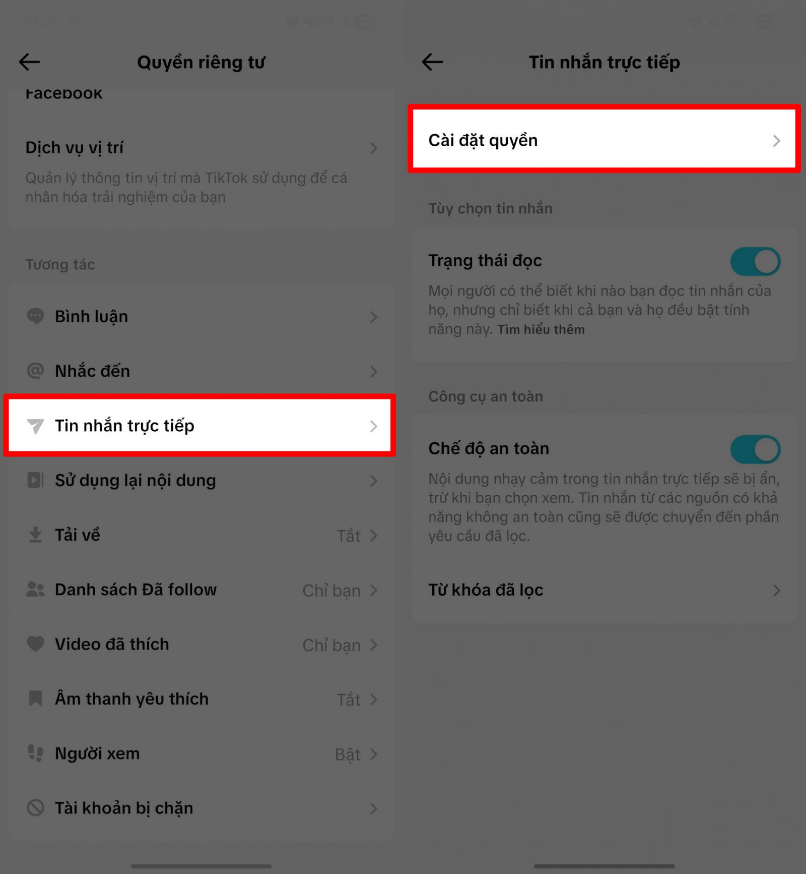 Bước 2: Trong giao diện Quyền riêng tư, tìm và chọn mục Tin nhắn trực tiếp → Chọn Cài đặt quyền.