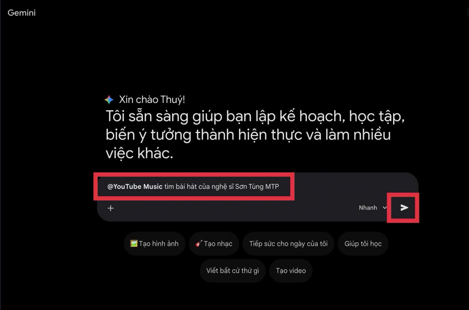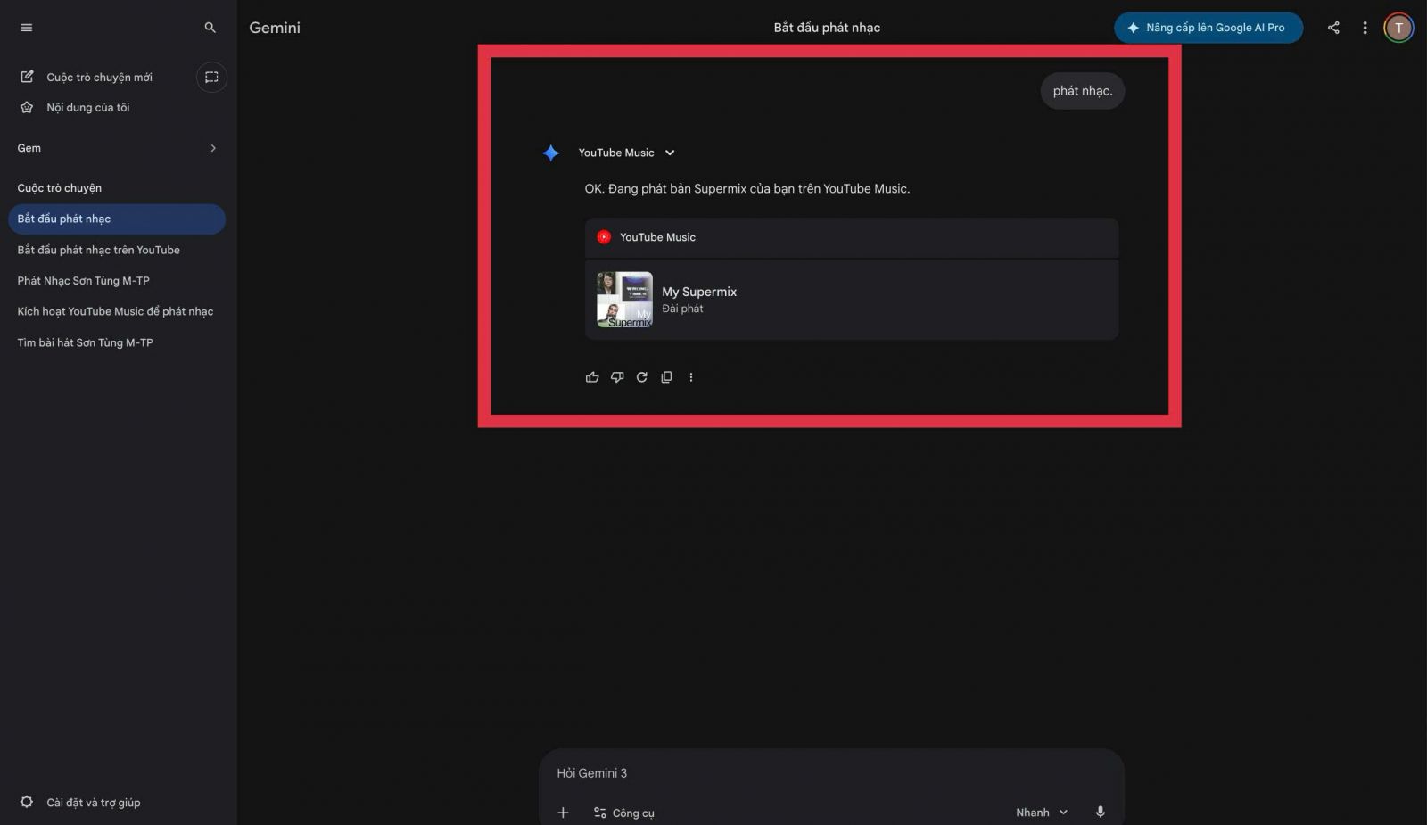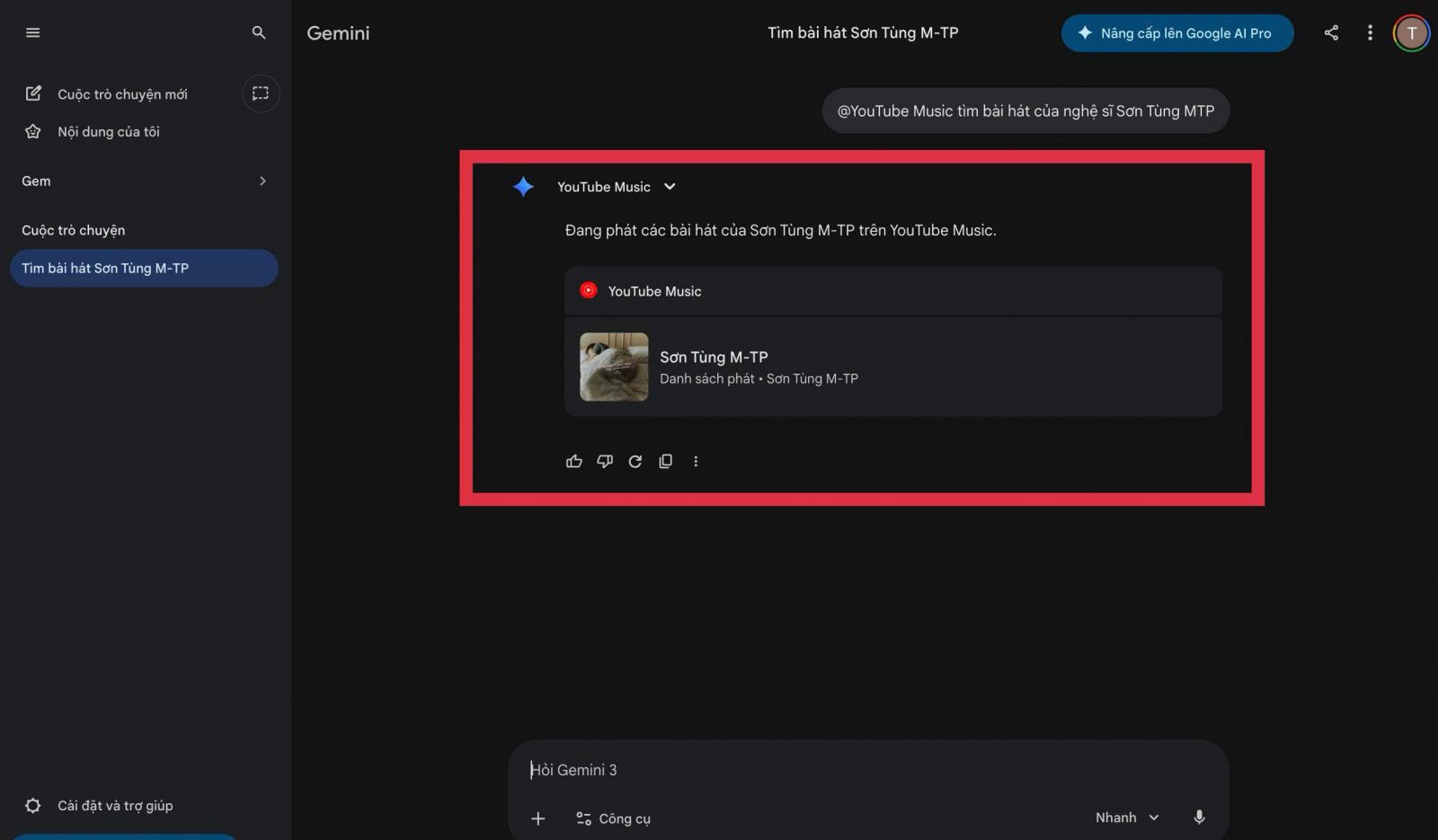 Ngoài ra, bạn chỉ cần nhập hoặc ghi âm các câu lệnh tự nhiên như “phát nhạc”, “Play Music” hay “phát bài hát của Sơn Tùng MTP”, Gemini vẫn có thể hiểu yêu cầu và hiển thị kết quả bài hát hoặc danh sách phát phù hợp.