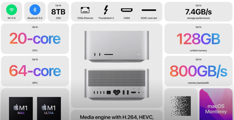 Mac Studio: 2 tuỳ chọn chip M1 Max và M1 Ultra, thiết kế quen thuộc, 6 cổng thunderbolt, 2 cổng USB-A, HDMI, khe cắm thẻ SD, kích thước 3.7-inch. Mức giá khởi điểm là $1,999 đối với phiên bản M1 Max và $3,999 đối với phiên bản M1 Ultra.