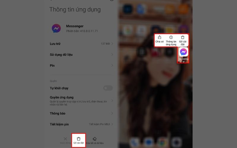 Bước 1: Trước tiên, để sử dụng tính năng này, bạn cần đảm bảo rằng điện thoại của bạn không còn ứng dụng Messenger. Để thực hiện việc này, bạn có thể truy cập vào "Cài đặt" trên điện thoại để xóa hoặc ấn giữ và gỡ cài đặt nó ngay trên màn hình chính.