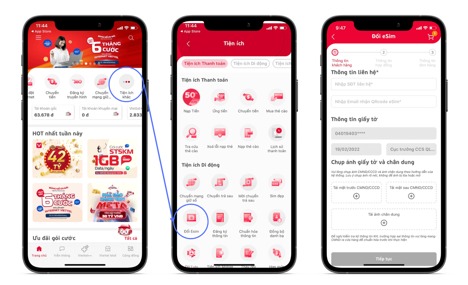 - Bước 2: Chọn Menu → Tiện ích khác → Đổi eSIM .
