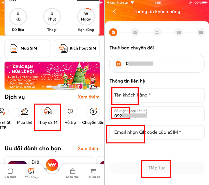- Bước 2: Chọn mục Thay eSIM. Điền đầy đủ thông tin theo yêu cầu gồm: họ tên khách hàng, số điện thoại liên hệ, email, sau đó nhấn Tiếp tục.