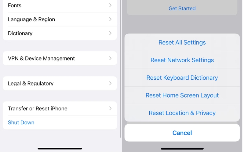 Khôi phục cài đặt có thể sửa chữa hầu hết các lỗi bao gồm cả tình trạng màn hình iPhone bị mờ. Bạn chỉ cần vào Cài đặt, nhấn Cài đặt chung và chọn mục Chuyển hoặc đặt lại iPhone (Transfer or Reset iPhone). Sau đó, hãy chọn Đặt lại và ấn vào Đặt lại tất cả cài đặt (Reset All Settings) là xong, cách này cũng có thể thực hiện trên iPhone 15.
