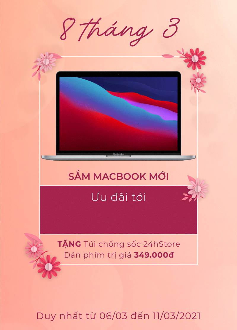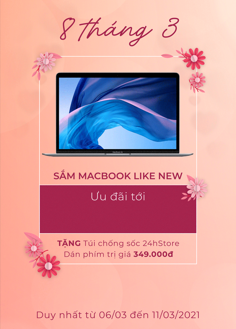 - Trong thời gian diễn ra chương trình 8/3, khi tham gia Thu đổi – lên đời MacBook tại 24hStore, Quý khách hàng sẽ được giảm 2.000.000đ trực tiếp trên giá sản phẩm mới, 3.000.000đ trên giá sản phẩm 99%, tặng thêm Voucher mua sắm lên đến 2.000.000đ.