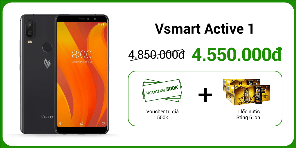 Trước tiên là em Vsmart Active 1, khi mua em ấy bạn sẽ được GIẢM 300k trực tiếp vào giá. Không chỉ vậy bạn còn nhận thêm 1 lốc nước ngọt Sting siêu ngon cùng với Voucher trị giá lên đến 500k.