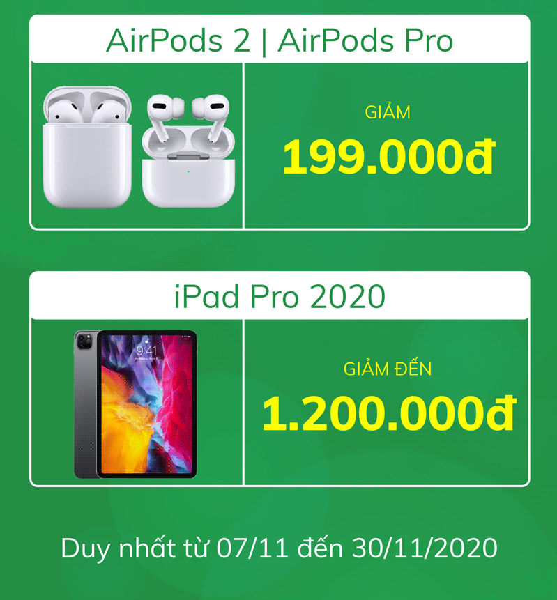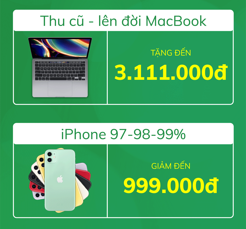 Thu cũ – lên đời MacBook tặng đến 3.111.000đ, iPhone 97-98-99% giảm đến 999.000đ, iPad Pro 2020 giảm đến 1.200.000đ, phụ kiện giảm đến 45%,… và rất nhiều ưu đãi khác duy nhất chỉ có trong chương trình Ưu đãi tháng 11 - Giá tốt hốt ngay!