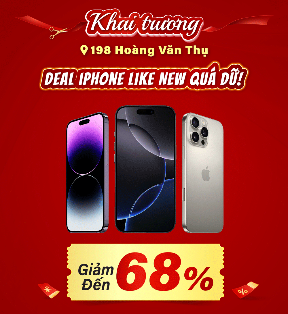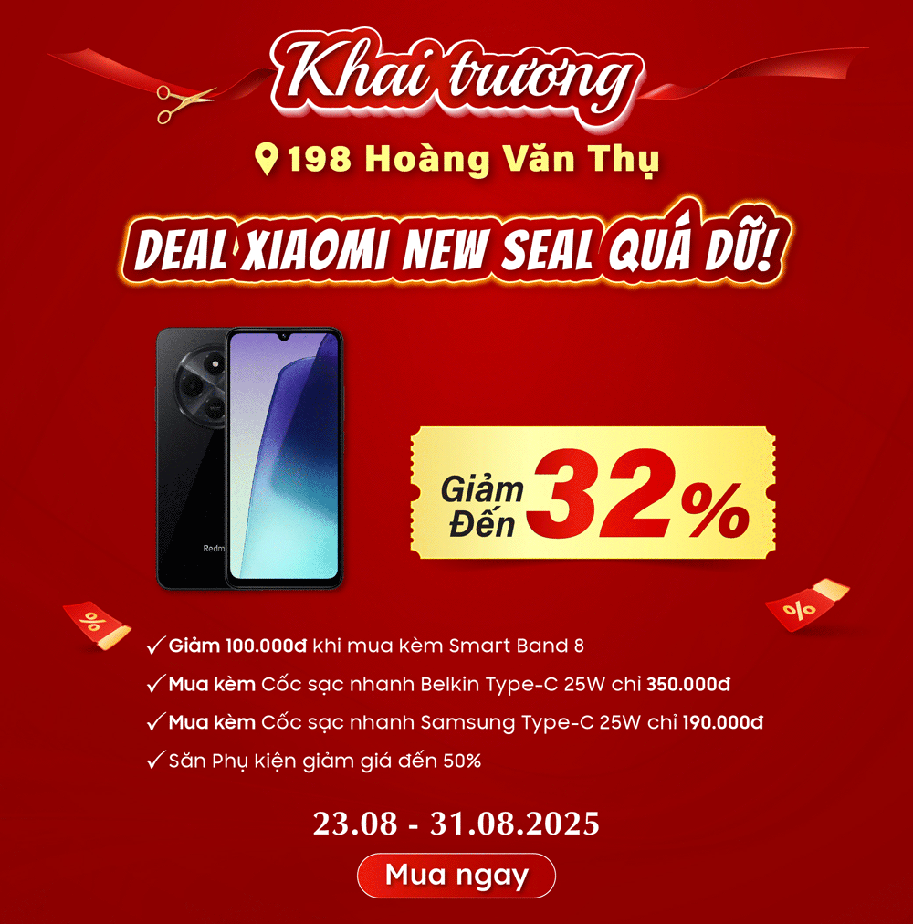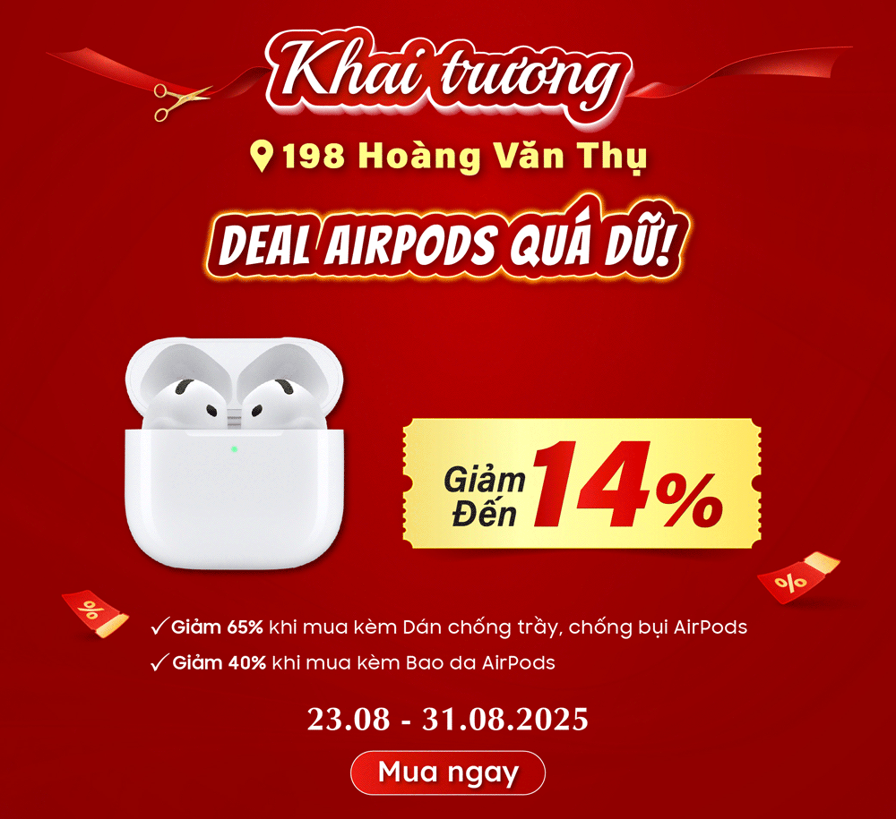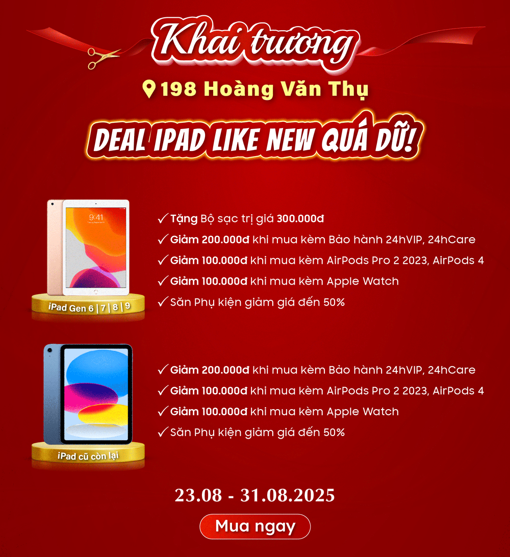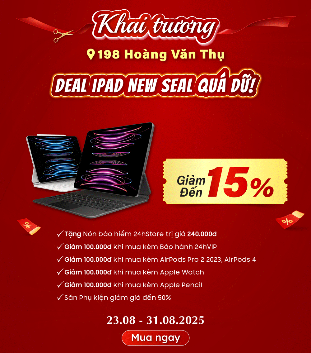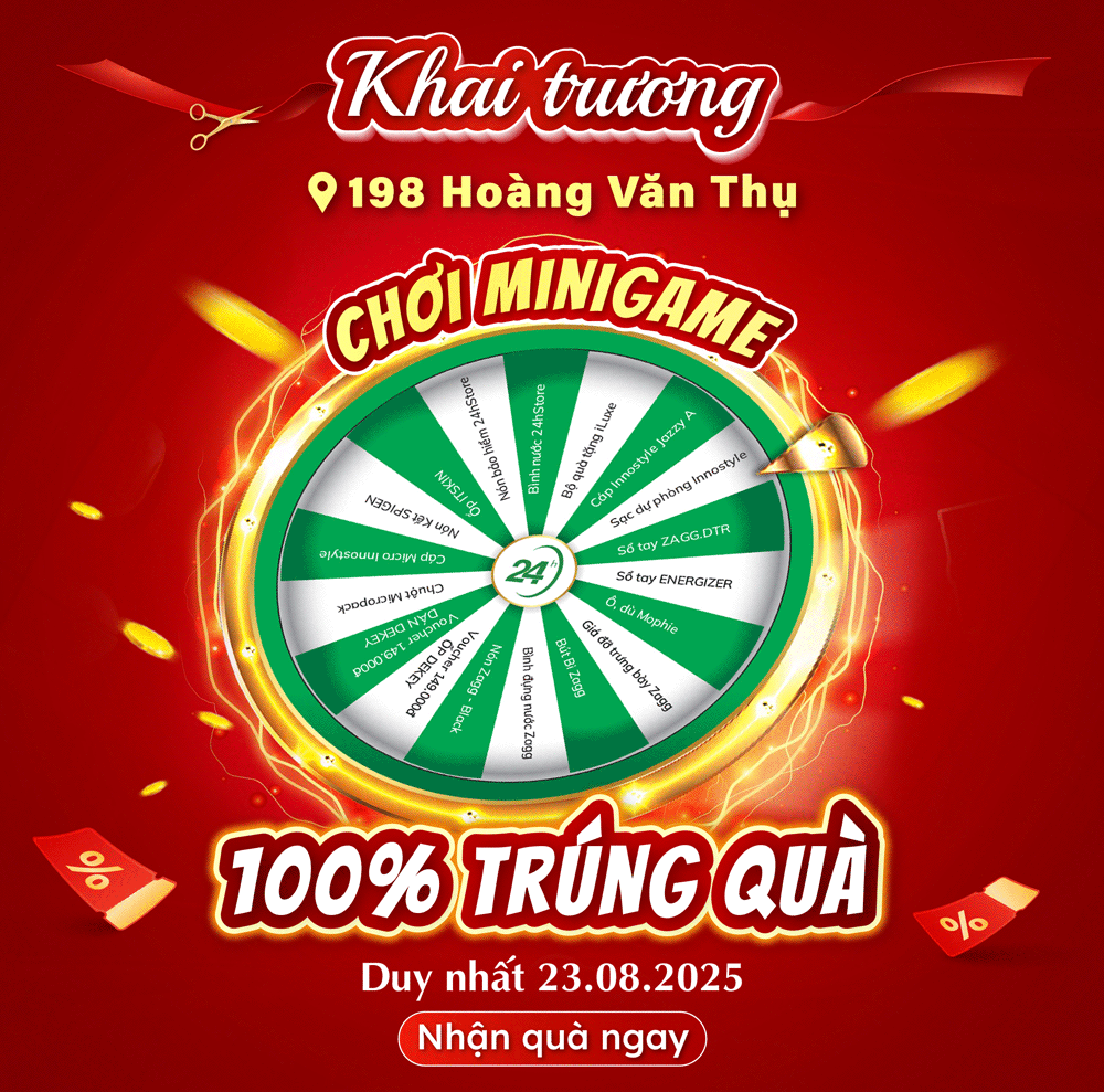23/08/2025, quẩy hết nấc tại 24hStore 198 Hoàng Văn Thụ: Tham quan 100% có quà, săn DEAL giá sốc số lượng có hạn, giảm đến 68% từ AirPods, iPad, MacBook đến smartphone iPhone, Samsung, Xiaomi đình đám, nhận Voucher đến 500.000đ và còn rất rất nhiều những ưu đãi khác! Mời quý khách nhanh chân tham dự buổi Khai trương 24hStore 198 Hoàng Văn Thụ - Tiệc QUÀ quá dữ!