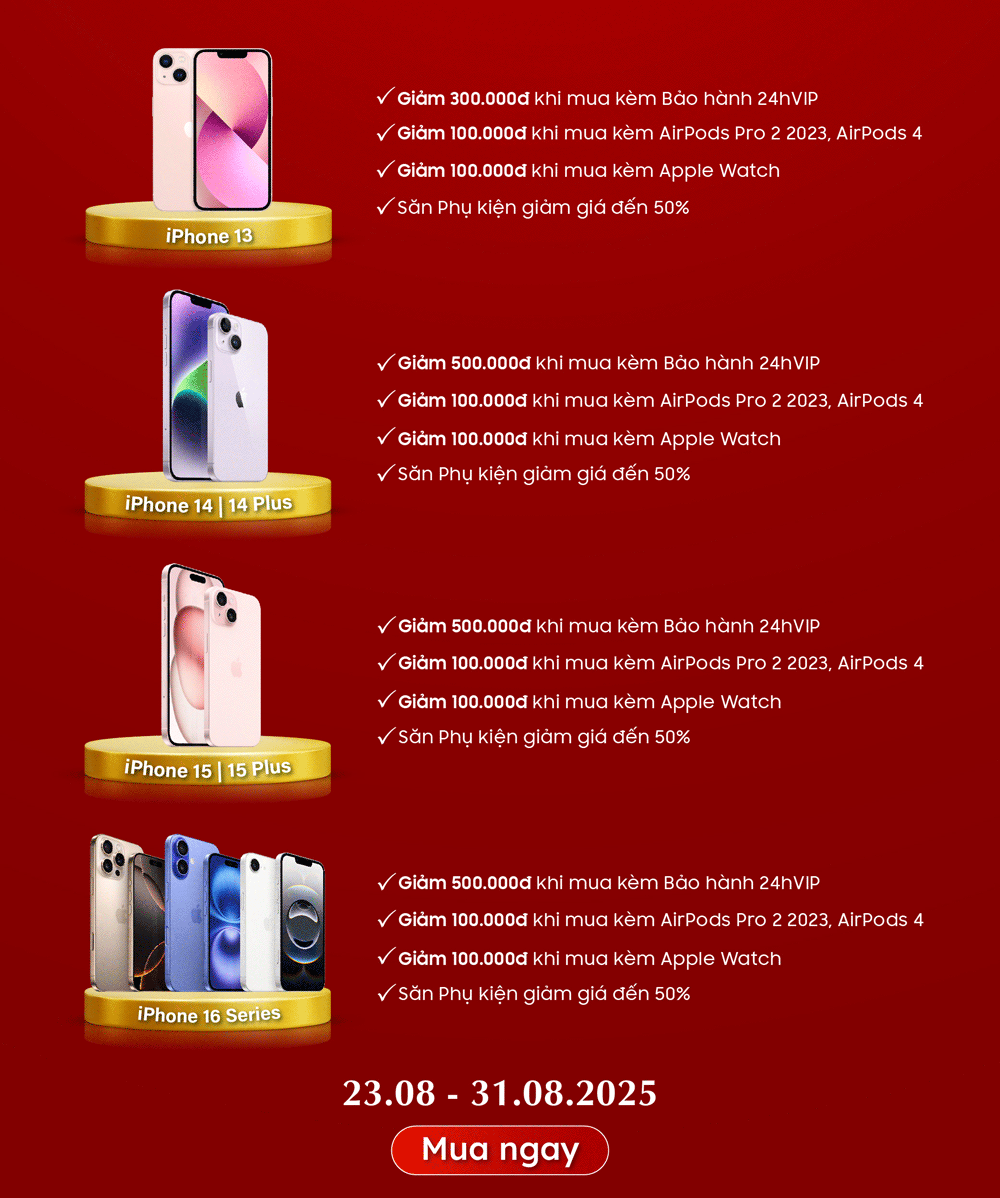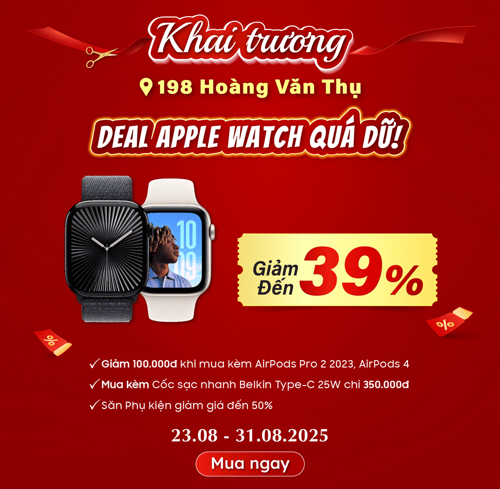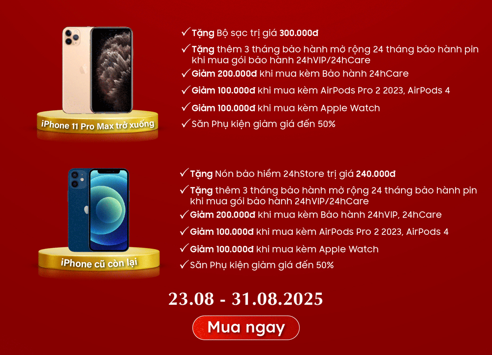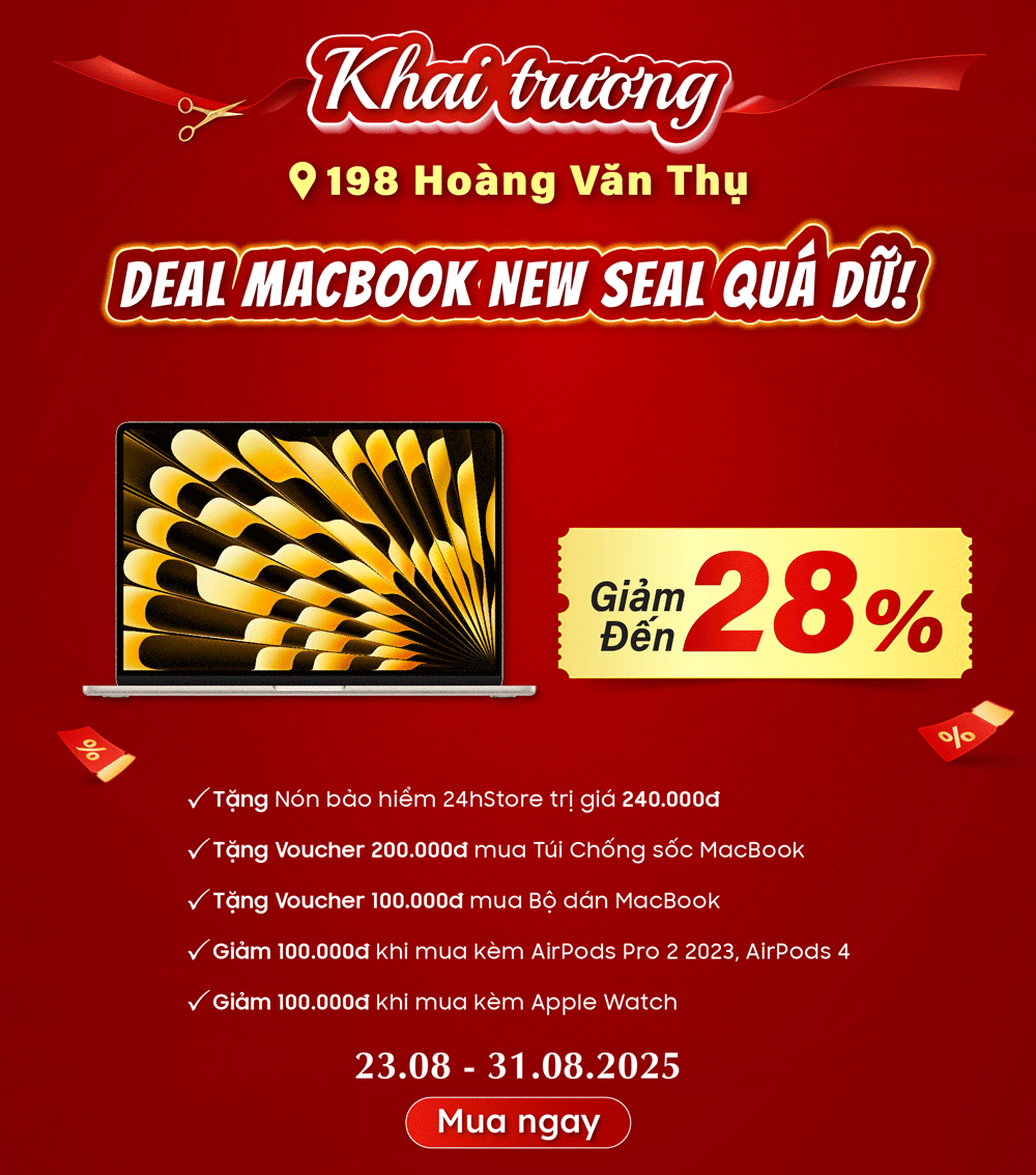 Duy nhất 23 - 31/08/2025, khi ghé chi nhánh 24hStore 198 Hoàng Văn Thụ, Quý khách sẽ được TẶNG NGAY Phụ kiện công nghệ và Voucher giảm đến 500.000đ, áp dụng cho cả mua máy lẫn sửa máy.