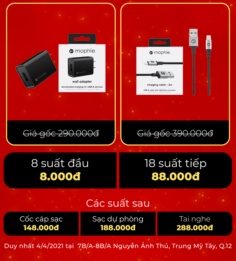 iPhone 7 32GB bán với giá 888.000đ, Tai nghe Bluetooth, Sạc dự phòng, Cốc - Cáp sạc chính hãng Energizer, Mophie, Innostyle,... bán với giá 8.000đ,... duy nhất trong Chương trình Khai trương Chi nhánh thứ 8: 7B/A-8B/A Nguyễn Ảnh Thủ, Trung Mỹ Tây, Quận 12 vào ngày 4/4/2021.