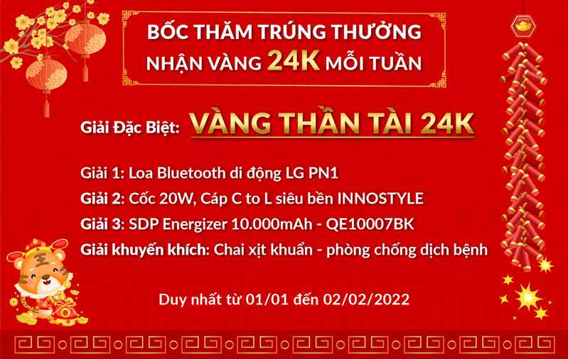 Vàng tượng trưng cho tiền tài, sự giàu sang phú quý, thịnh vượng. Tặng vàng dịp Tết cũng giống như trao lộc đầu năm vậy. Vì vậy, để mừng xuân Nhâm Dần, 24hStore quyết định tổ chức chương trình BỐC THĂM TRÚNG THƯỞNG - NHẬN VÀNG 24K MỖI TUẦN nhằm gửi lời tri ân sâu sắc đến Quý Khách hàng – những người đã luôn đồng hành và ủng hộ 24hStore trong suốt năm qua.