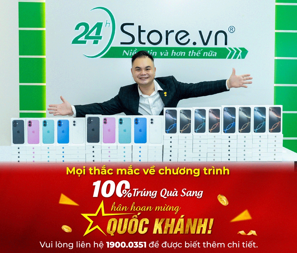 Kỷ niệm 80 năm Quốc khánh 2/9, 24hStore dưới sự dẫn dắt của Anh Hồ Tác Thành - Giám đốc điều hành, tổ chức chương trình 100% trúng quà sang – Hân hoan mừng Quốc khánh!. Trong tháng 9 này, khách hàng mua sắm sẽ được tham gia minigame nhận quà giá trị như iPhone 16 Pro Max, iPhone 15, Galaxy Z Flip7, MacBook Air M4, iPad A16, Apple Watch Series 10, AirPods 4… cùng hàng ngàn Voucher hấp dẫn, đảm bảo ai cũng có quà. Đồng thời, toàn bộ sản phẩm giảm đến 66%, thu cũ lên đời iPhone 16 Pro Max tặng AirPods 4 hoặc Voucher 2.500.000đ.