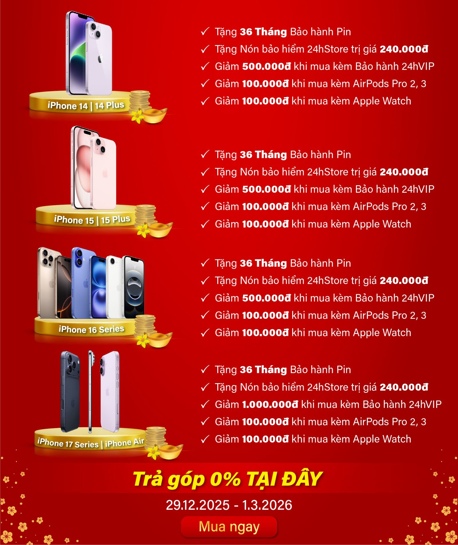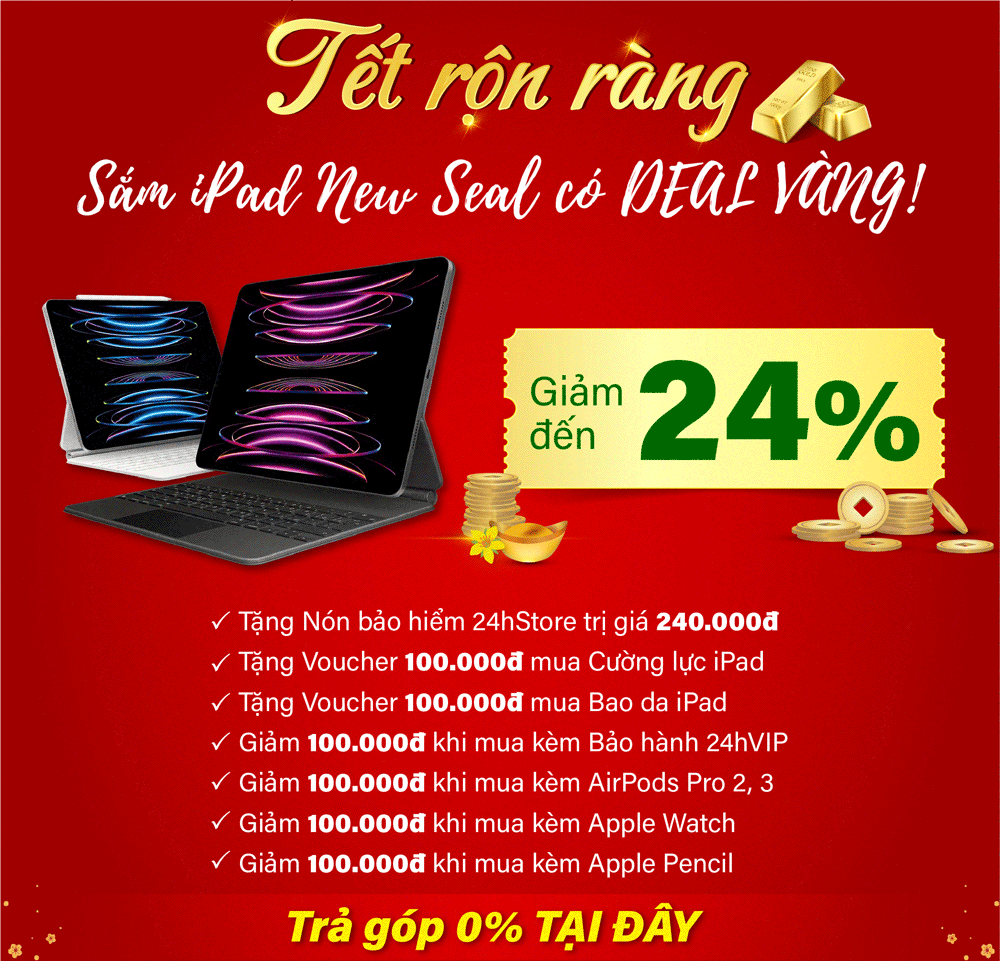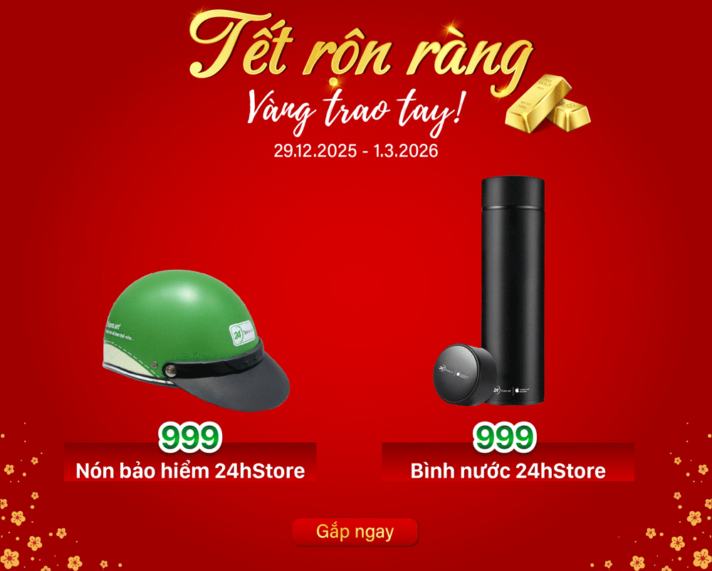 Nhân dịp Tết đến xuân về, 24hStore gửi đến các bạn Học sinh - Sinh viên và các Bác tài công nghệ những Voucher lì xì đầu năm như một lời chúc bình an - thuận lợi - đủ đầy. Mong rằng với sự sẻ chia này, Quý khách có thể dễ dàng nâng cấp thiết bị công nghệ phục vụ học tập, làm việc và kết nối để bước vào năm mới nhẹ gánh chi phí - vững bước tương lai.