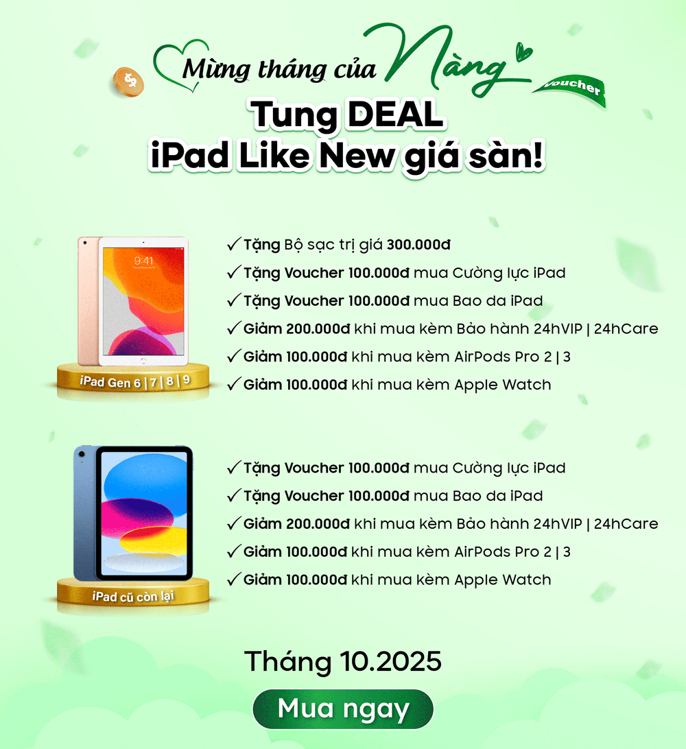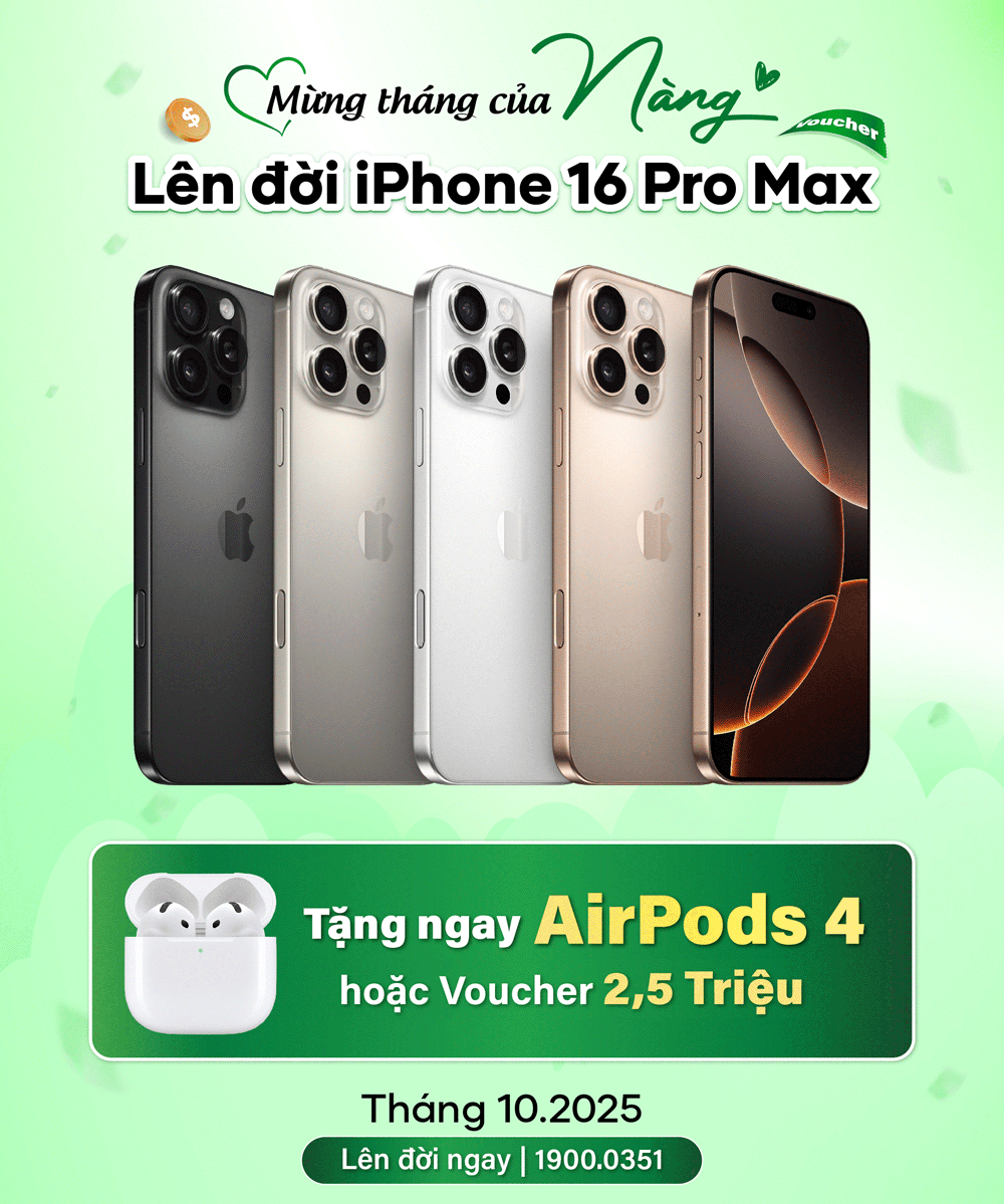 Tháng 10 này, 24hStore trân trọng dành tặng những điều đặc biệt nhất cho các Nàng - những bông hồng luôn tỏa sáng và lan tỏa yêu thương. Hãy để bản thân được chiều chuộng và tận hưởng trải nghiệm mua sắm đầy bất ngờ với hàng loạt ưu đãi cực giá trị trong chương trình Mừng tháng của Nàng - Ngập tràn Quà Tặng!: từ Voucher đặt trước giảm đến 500.000đ đến minigame 100% trúng quà với phần quà giá trị cao nhất lên đến 17.000.000đ. Không chỉ vậy, thu cũ đổi mới iPhone 17, iPhone 17 Pro, iPhone Air và iPhone 16 Pro Max còn được tặng Apple AirPods 4 hoặc Voucher trợ giá 2.500.000đ, giúp Nàng dễ dàng lên đời iPhone mới với giá tốt nhất.