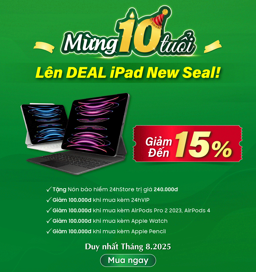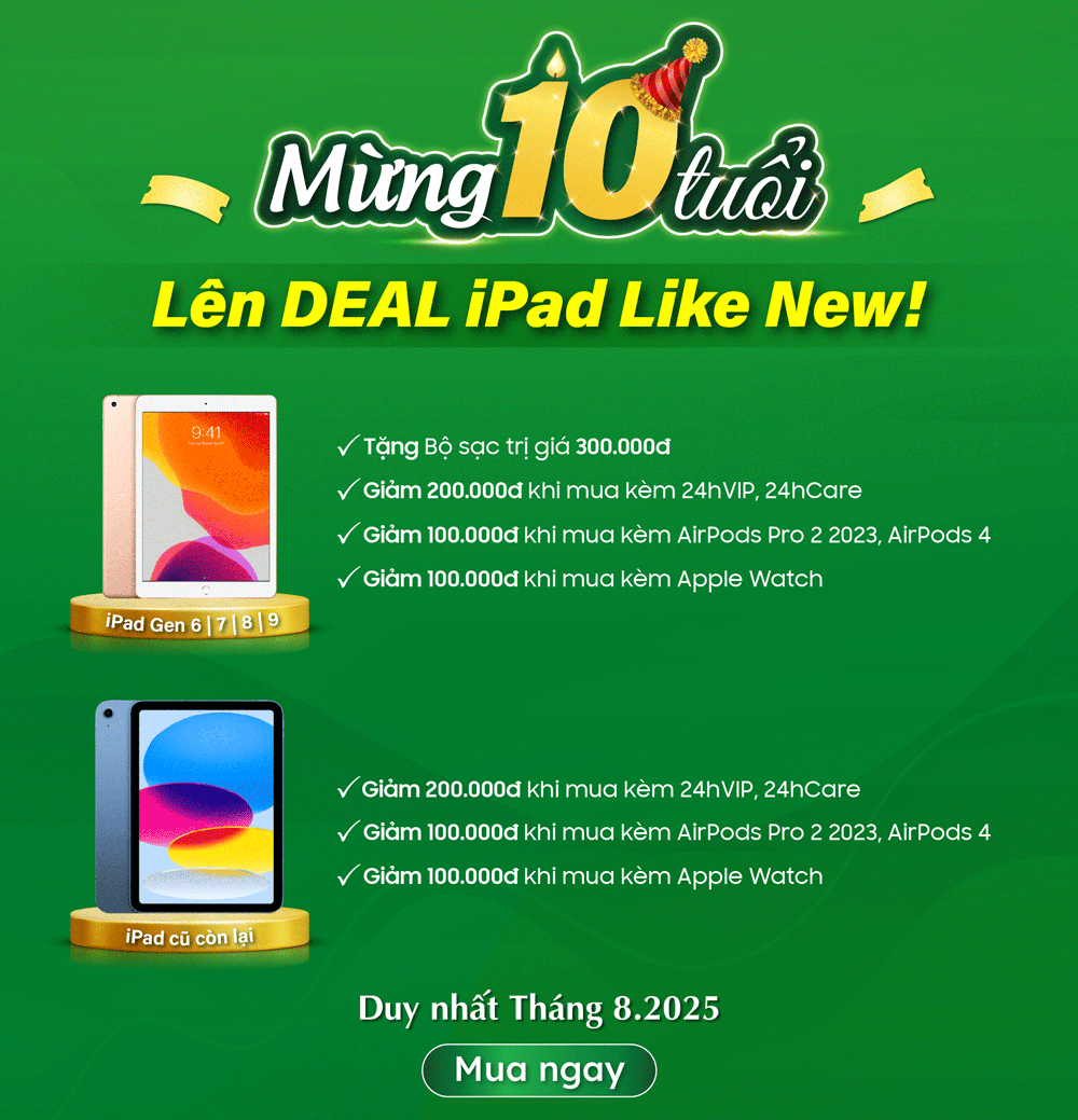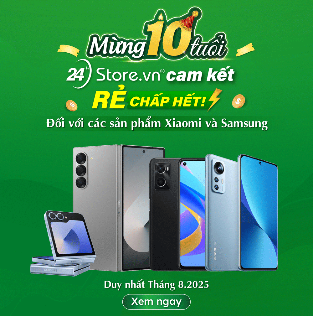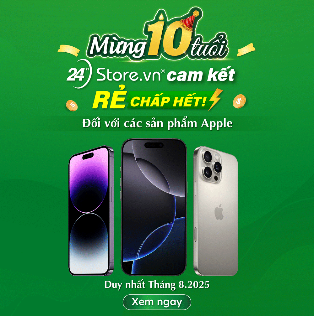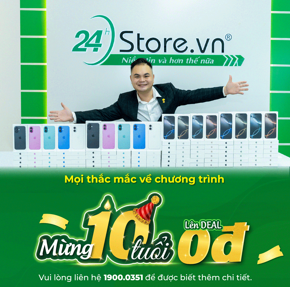 Mừng lên 10 - Lên DEAL 0đ! Ăn mừng sinh nhật suốt tháng, 24hStore lên 10, chơi lớn gấp 10: Giảm giá toàn bộ sản phẩm đến 65%, tặng Voucher tới 500.000đ trừ trực tiếp vào giá máy, áp dụng cho các dòng iPhone, iPad, MacBook, Apple Watch, Samsung, Xiaomi,... Đặc biệt, mua máy hay sửa máy đều được TẶNG Phụ kiện 0đ!