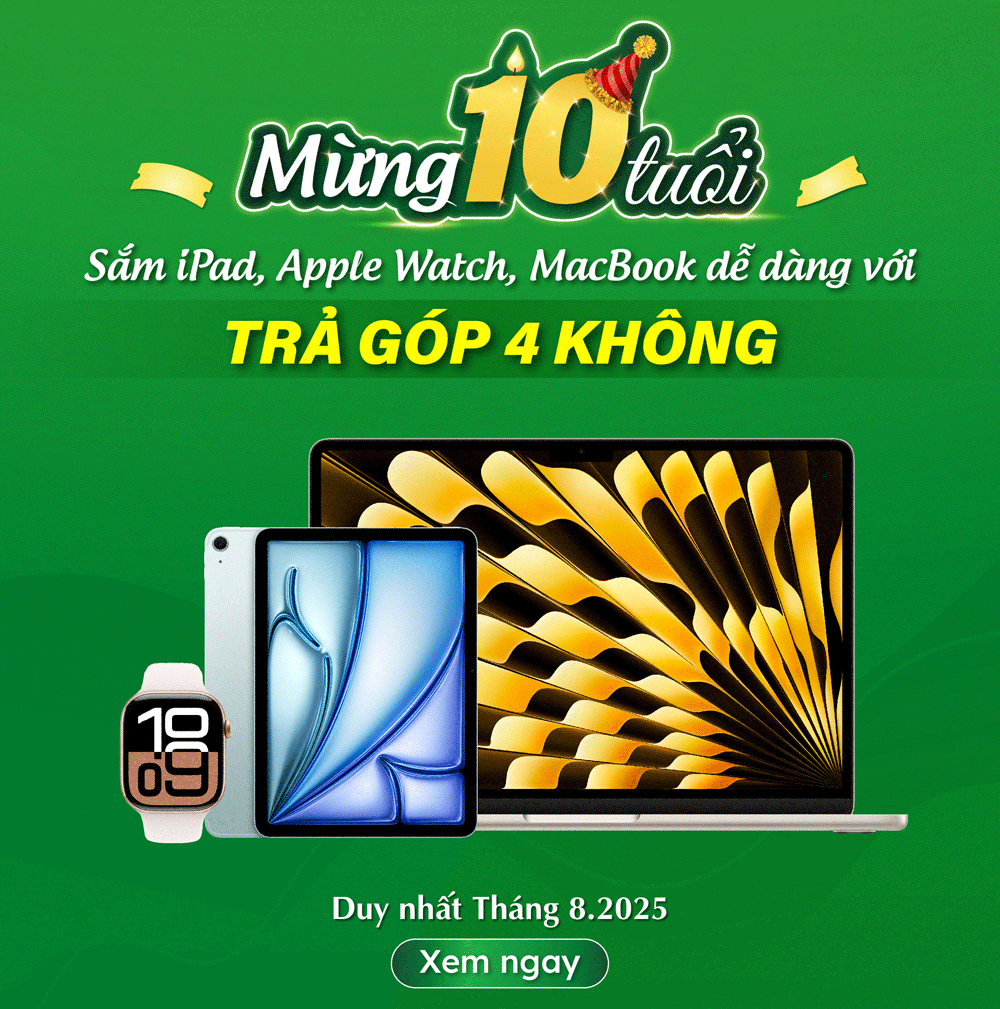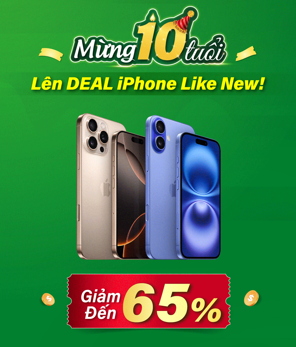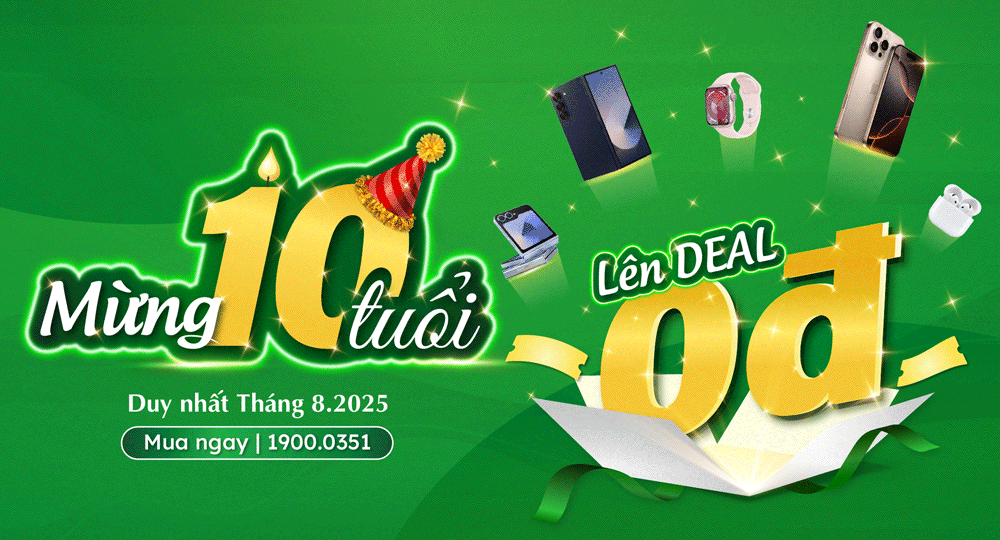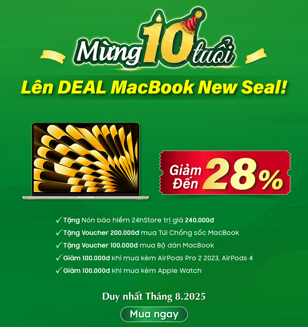 Mừng lên 10 - Lên DEAL 0đ! Ăn mừng sinh nhật suốt tháng, 24hStore lên 10, chơi lớn gấp 10: Giảm giá toàn bộ sản phẩm đến 65%, tặng Voucher tới 500.000đ trừ trực tiếp vào giá máy, áp dụng cho các dòng iPhone, iPad, MacBook, Apple Watch, Samsung, Xiaomi,... Đặc biệt, mua máy hay sửa máy đều được TẶNG Phụ kiện 0đ!