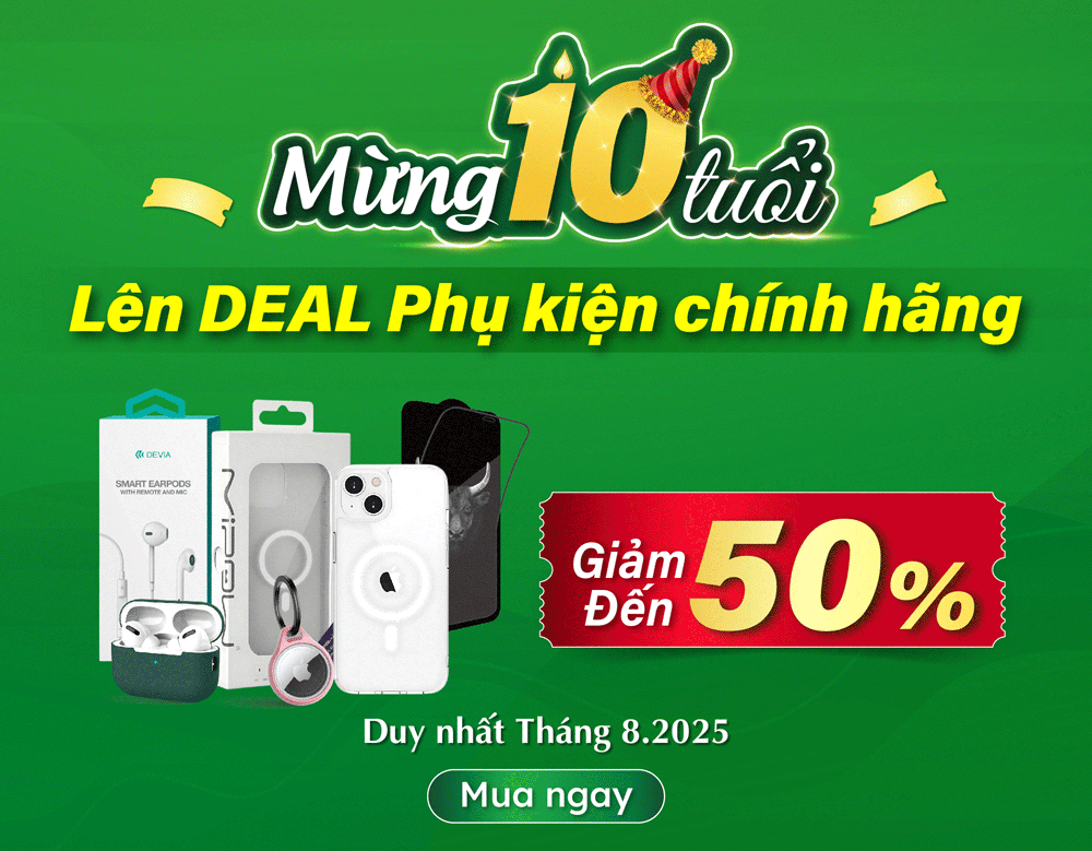 10 năm trưởng thành - là 10 năm học cách phục vụ tốt hơn. Voucher 500.000đ là lời cảm ơn cụ thể. Phụ kiện 0đ là sự chuẩn bị chu đáo. Mời Quý khách vào tiệc cùng chúng em!