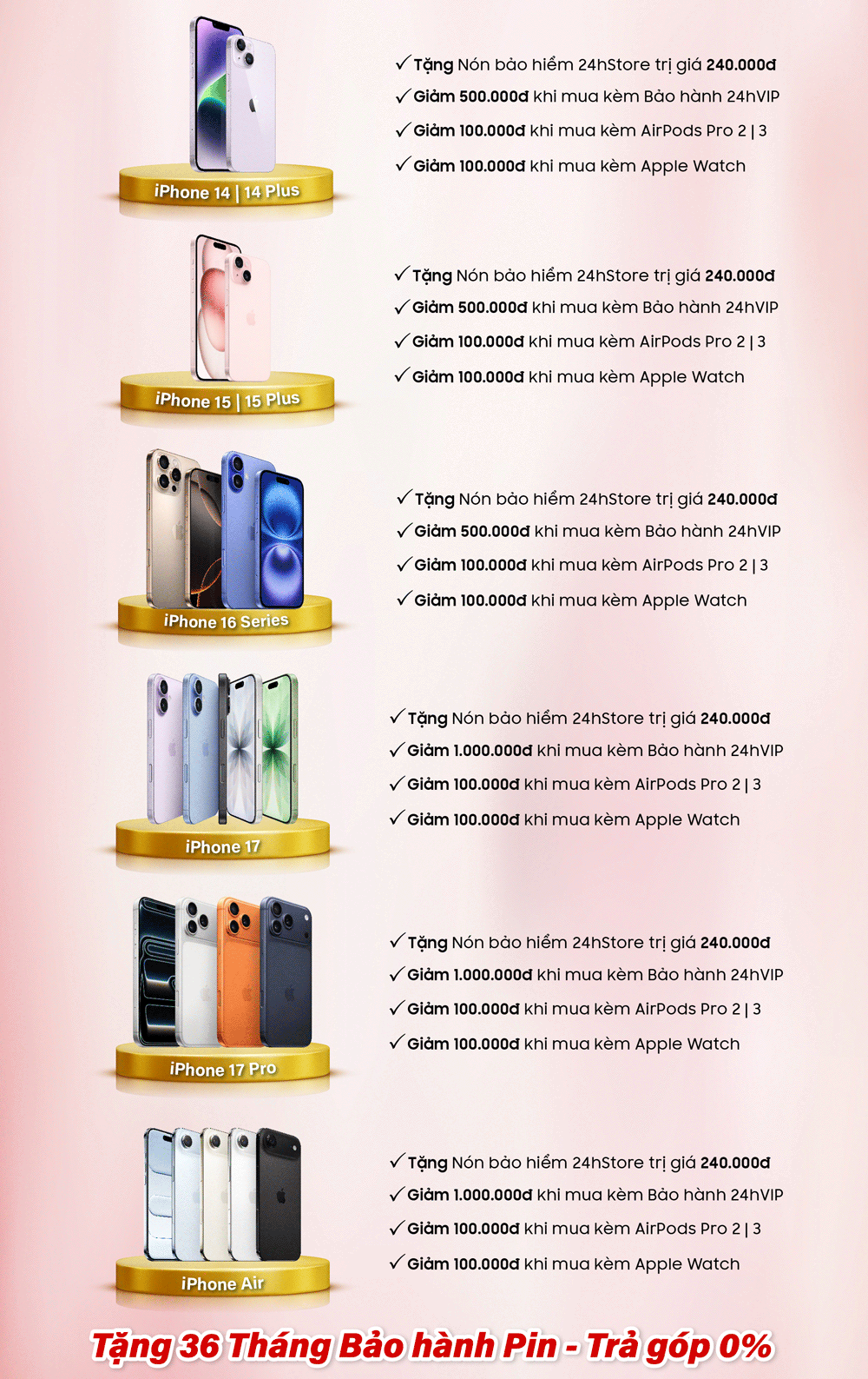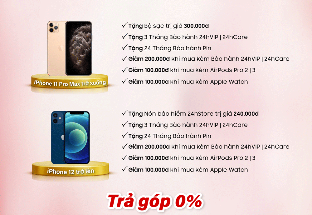 Từ gói bảo hành 24hVIP, 24hCare cho iPhone cũ với thời gian bảo hành nâng lên 15 tháng - pin đến 36 tháng, tới các ưu đãi phụ kiện dành riêng cho từng dòng iPhone, iPad, MacBook, Samsung, Xiaomi,... tất cả đều được thiết kế theo hướng thiết thực và dễ lựa chọn. Nàng không cần mất thời gian tìm mua thêm từng món, vì mọi quyền lợi đã được chuẩn bị sẵn với mức giá tốt nhất khi mua cùng máy.