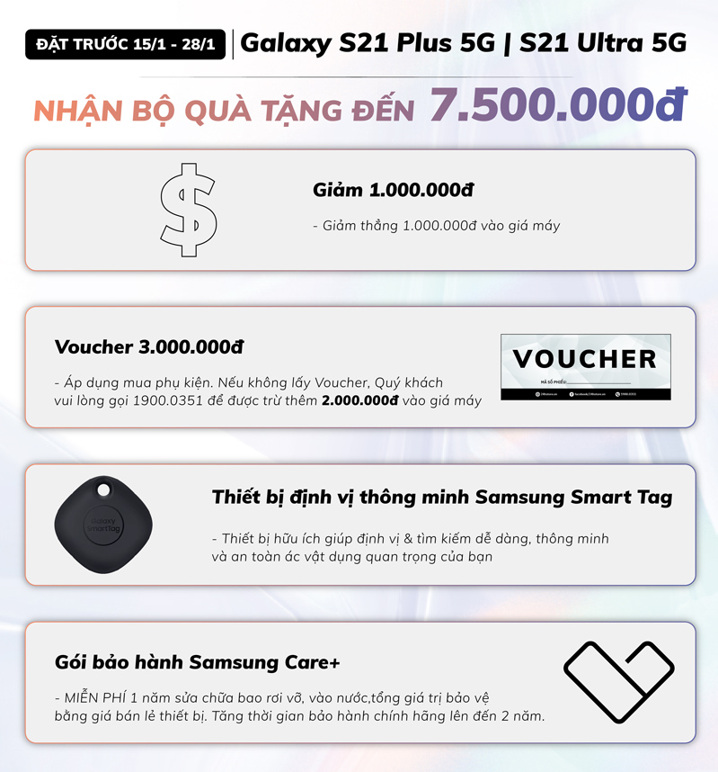 Chỉ 500.000đ đặt trước siêu phẩm mới nhất nhà Samsung - Samsung Galaxy S21 Plus 5G và Samsung Galaxy S21 Ultra 5G, Quý khách hàng sẽ nhận bộ quà tặng lên đến 7.500.000đ.