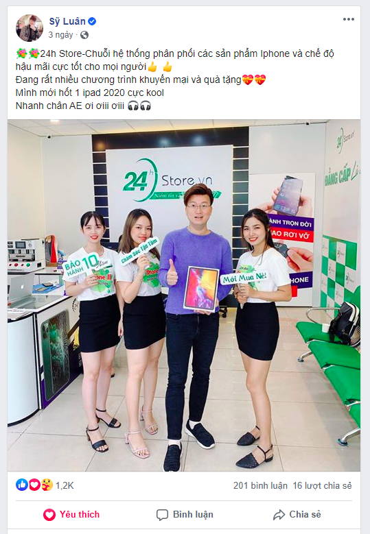 Với chiếc iPad Pro mới nhất thị trường, lại mua được với mức giá hời nhân dịp Sinh nhật lần thứ 5 của 24hStore, Sỹ Luân lập tức chia sẻ lên Facebook dòng trạng thái kêu gọi mọi người đến tham gia mua sắm.