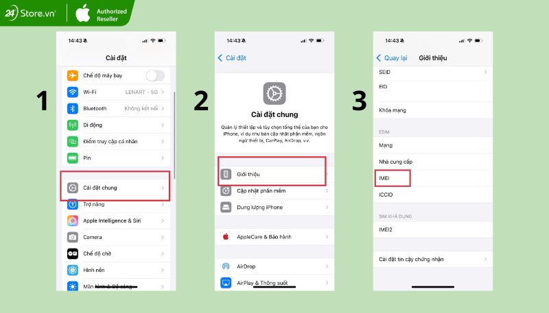 Bước 1: Vào Cài đặt chung > Giới thiệu để lấy số IMEI hoặc có thể xem trực tiếp trên hộp máy.