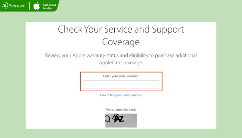Bước 2: Truy cập vào trang web kiểm tra bảo hành chính thức của Apple (https://checkcoverage.apple.com). Rồi nhập số IMEI và mã xác nhận được yêu cầu.
