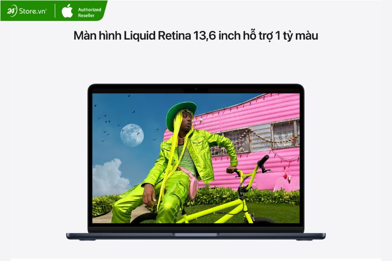 Màn hình Liquid Retina: MacBook Air M5 mang đến hai tùy chọn kích thước là 13,6 inch (2.560 x 1.664 pixels) và 15,3 inch (2.880 x 1.864 pixels), phù hợp với mọi nhu cầu từ di động đến đa nhiệm không gian lớn. Cả hai phiên bản đều sở hữu độ sáng 500nits, hỗ trợ dải màu P3 và hiển thị lên đến một tỷ màu, giúp hình ảnh trở nên sống động, sắc nét và chân thực đến từng chi tiết.