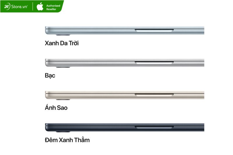 Bốn tùy chọn màu sắc: Xanh Da Trời, Bạc, Ánh Sao và Đêm Xanh Thẳm, đi kèm cáp sạc MagSafe cùng tông màu tương ứng. Việc duy trì bảng màu này mang đến sự lựa chọn đa dạng, phù hợp với nhiều phong cách và sở thích cá nhân của người dùng.