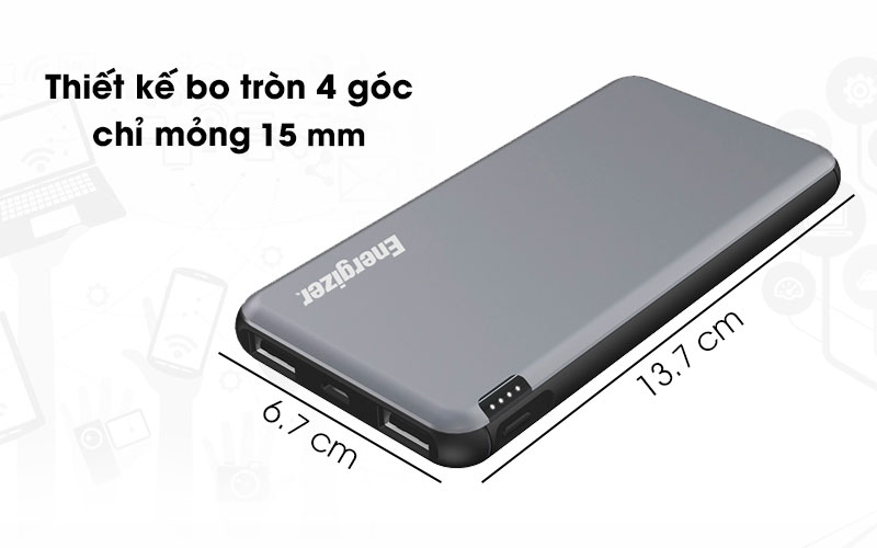 Pin sạc dự phòng Energizer có độ dày 15mm và chỉ nặng 203g rất mỏng và nhẹ. Kết hợp với đó là thiết kế bo tròn 4 góc và được bao bọc bởi kim loại nguyên khối chắc chắn, sáng bóng, lịch lãm. Không những đẹp mắt mà còn giúp người dùng tự tin cầm nắm khi di chuyển. Bên cạnh đó lớp vỏ của pin sạc còn có độ bền bỉ cao, bảo vệ pin sạc một cách tốt nhất.