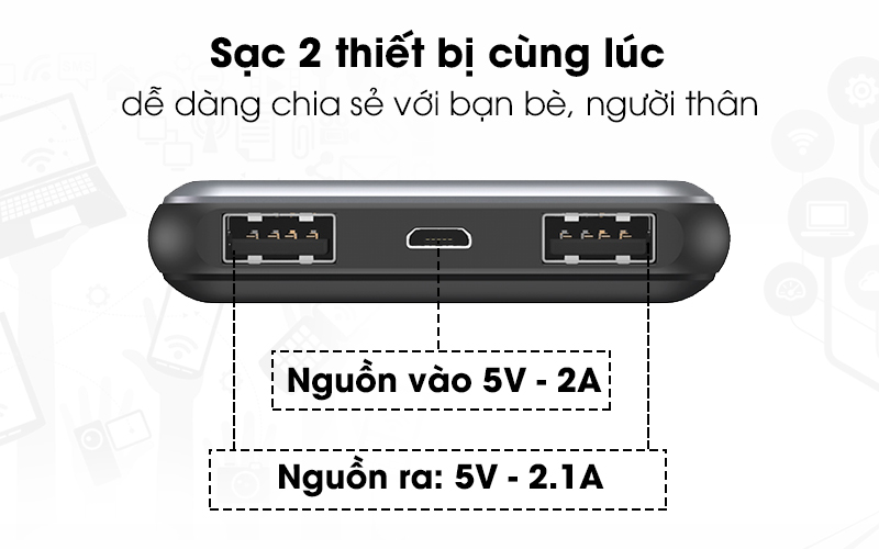 Hỗ trợ thiết bị 2 đầu ra USB sạc 2 thiết bị cùng lúc